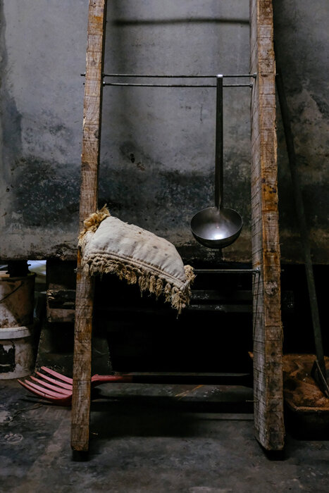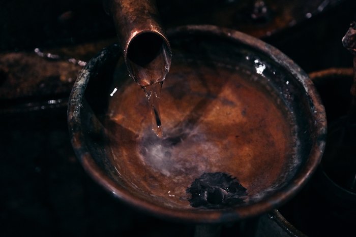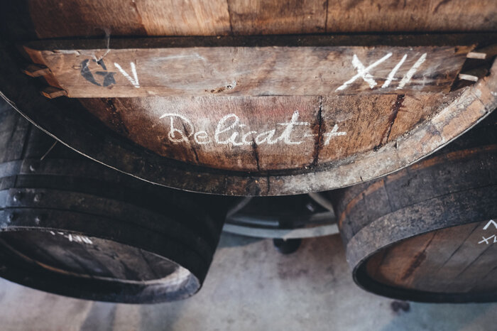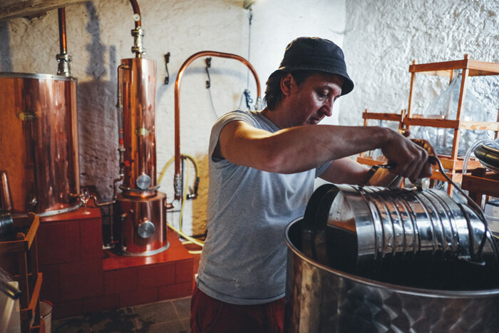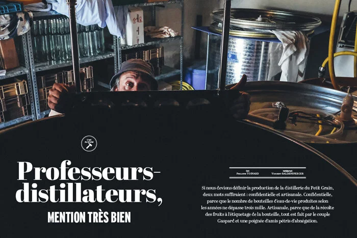 "Si nous devions définir la production de la distillerie du Petit Grain, deux mots suffiraient : confidentielle et artisanale. Confidentielle, parce que le nombre de bouteilles d'eau-de-vie produites selon les années ne dépasse pas trois mille. Artisanale, parce que de la récolte des fruits à l'étiquetage de la bouteille, tout est fait par le couple Gaspard et une poignée d'amis pétris d'abnégation".